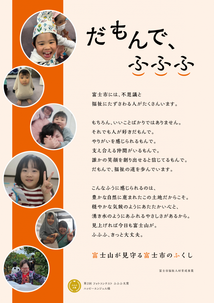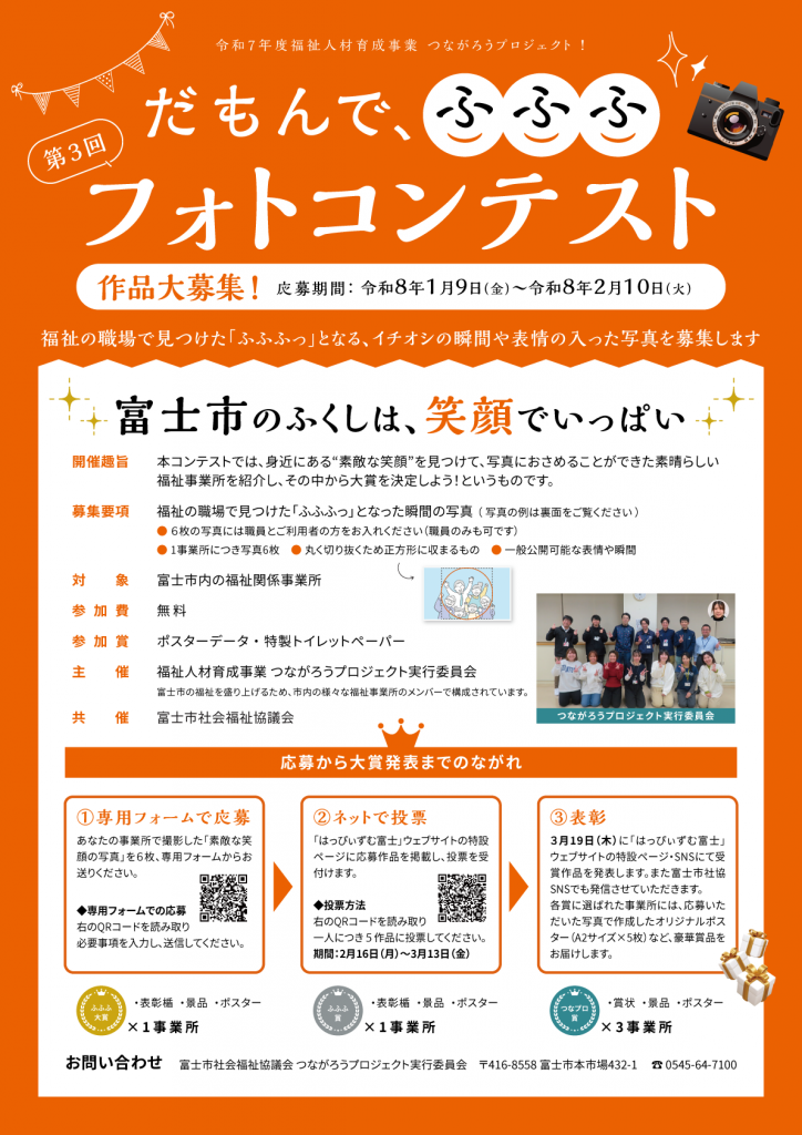 このたび、福祉の現場で生まれる「笑顔(ふふふ)」の写真を募集し、広く発信することで「富士市の福祉は魅力的」「福祉の仕事をしてみたい」と感じていただける新たな仲間(福祉人財)を増やすことを目指して「第3回 だもんで、ふふふ フォトコンテスト」を開催いたします。